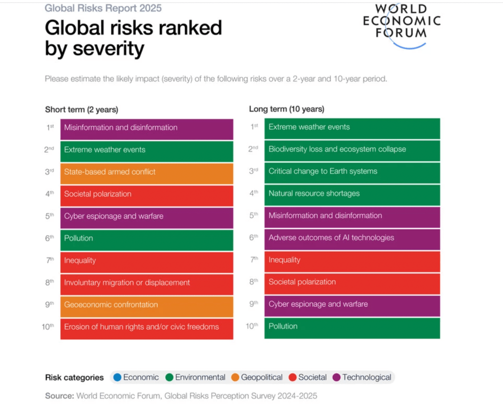 Yesterday the World Economic Forum released its annual Global Risks Report which explores some of the most severe risks the world could encounter in 2025, 2027, and over the next decade.