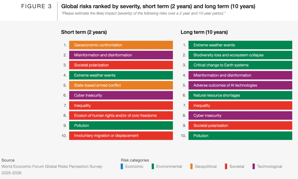 This year it combines the results of the latest Global Risks Perception Survey (the views of over 1,300 global leaders and experts) and in-depth analysis of this survey by 161 experts across the World Economic Forum’s Centres. It’s a goldmine of analysis of potential global risks through three timeframes: 2026, 2028, and 2036.